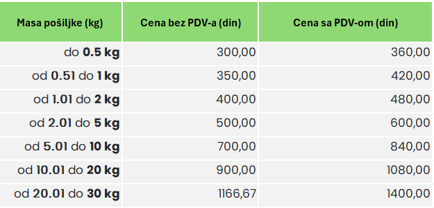 Cena dostave zavisi od količine i težine proizvoda kao i dimenzija kupljenih proizvoda i uslova na terenu. Cena isporuke je prikazana u tabeli ispod ovog teksta.